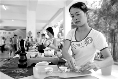 8月26日,广西钦州市灵山县那隆镇农民谢植彬在参加茶艺比赛。