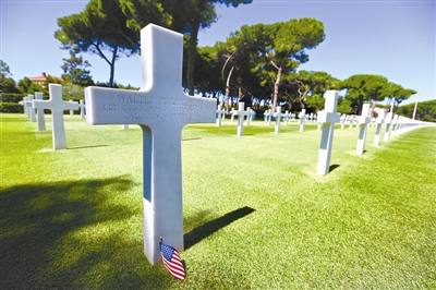 8月26日,在意大利内图诺“从西西里到罗马”美军公墓,一座墓碑前插着一面美国国旗。在罗马南端小镇安齐奥狭窄的街巷中左弯右绕,终于找到了建于17世纪的阿黛莱别墅。这里如今是安齐奥战役博物馆,其中展出的大量二战中盟军使用的装备和各类关于安齐奥战役的史料,那些黑白泛黄的照片,仍能唤起人们对那场恶战的回忆和感慨。