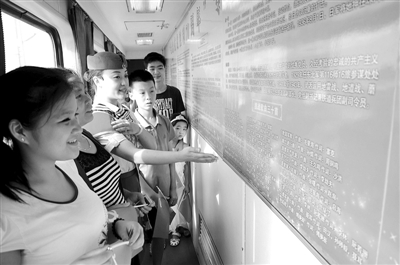 8月26日,T9次列车工作人员在向旅客介绍抗战主题展板。