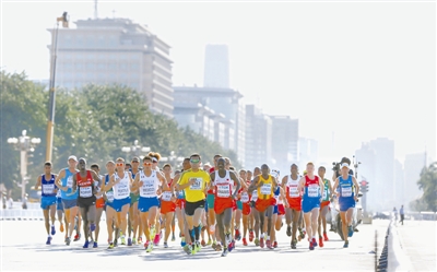 男子马拉松比赛,业余选手与专业选手同场竞技。CFP供图