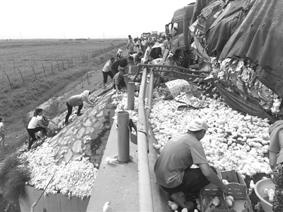 2015年8月25日,山东荣乌高速滨州沾化区段,一辆山东禽类运输车倾翻,数万只小黄鸡散落在地, 附近村民闻讯,纷纷前来抓小鸡,不少人还开着三轮车,整车装回,还有被堵在路上的人下车加入抢鸡队伍。图为忙得不亦乐乎的老乡们。而这让车祸司机遭受的损失,雪上加霜。陈杰/CFP