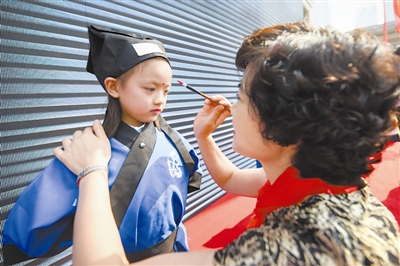 当日,安徽省合肥市南门小学森林城校区为一年级新生举行传统“开笔礼”,孩子们通过参加“正衣冠”“击鼓鸣志”“朱砂启智”、朗诵《弟子规》等活动,感知国学传统文化,迎接新学期的到来。 新华社记者 张端 摄