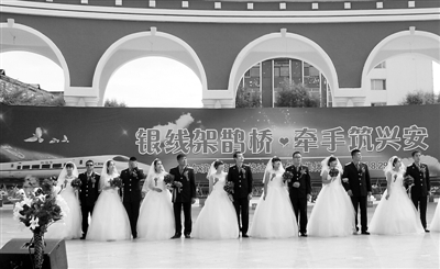 8月29日10时,哈尔滨铁路局加格达奇工务段工会举办的“银线架鹊桥,牵手筑兴安”集体婚礼在大兴安岭加格达奇文化广场举行,10对扎根边疆,奉献兴安的养路工人喜结连理。