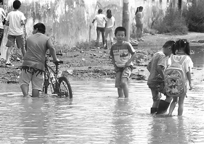 8月27日,位于郑州市建设西路的西岗村小学附近,通往学校的道路被积水淹没,无奈上下学的孩子只能涉水通过。