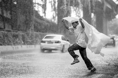 8月29日,广州市三元里大道,一位工人披着塑料布在大雨中狂奔。