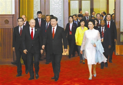 习近平和夫人彭丽媛同参加招待会的外国领导人共同步入宴会厅。 新华社记者 刘卫兵 摄