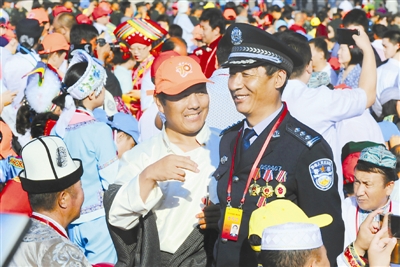 9月3日,纪念中国人民抗日战争曁世界反法西斯战争胜利70周年大会在天安门广场举行。位于天安门广场西临时观礼台的少数民族参观团英模代表高尖措正与同团成员交流。
