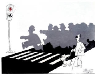 漫画《过马路》,好比是“颜医生”出具的一张CT 片。在这里,我们看到一幕奇异的景象:与遵章守法的导盲犬和它的主人形成鲜明对比的,是一群对交通信号视而不见的闯红灯大军。