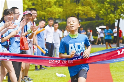近日,由上海国际汽车城(集团)有限公司主办,上海奥缘体育文化发展有限公司、链轮铁三俱乐部承办的2015“玖玖金服”VGT铁人三项赛在上海汽车博览公园内鸣枪开赛。本次比赛新增VGT(Village Green Triathlon,意为“乡村绿色铁三”)体验组,即100米开放水域游泳、10公里自行车加2.3公里跑步。图为一名参与VGT体验组的小朋友在众人的掌声中冲过终点线。本报记者 郎成 摄影报道