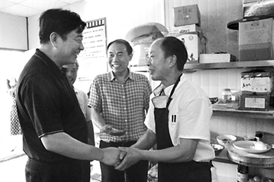 中铁十一局集团公司工会要求工会干部重心下移,走进施工一线,开展调查研究,面对面服务职工。近来在全集团组织开展的“我堵漏洞,我尽责;我创效益,我光荣”、“员工满意食堂”、“关爱劳模创造价值”等活动,都是在充分调研基础上组织开展的。图为集团党委副书记、工会主席彭新(左)在四公司武汉地铁机场线一工区食堂与炊事员滕树学(右)拉家常,听取他对工会工作的意见。韩丽娜 郑传海 摄