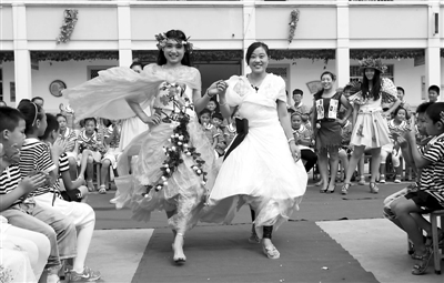 9月9日,山东枣庄市红旗小学教师在校园内简易的“T台”上向学生展示用废旧物品制成的环保时装“秀”。当日,教师们化身“模特”,在T台上演绎环保“秀”、戏装“秀”、旗袍“秀”、时装“秀”等,向学生们展示人民教师讲台下的别样风采,共同感悟美好生活,喜迎第31个教师节的到来。吉 喆 张立超 摄