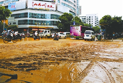 9月7日凌晨,广西梧州市城区遭遇暴雨天气,由于城区建筑工地众多,雨水携着工地上的泥土流到街道上,淌满了不少路段,有的路段泥水深达20厘米,一眼望过去黄色一片。车辆和行人在这样的街道上来来往往,鞋子、裤脚都沾上了“黄金泥”,一不小心还会滑倒。有些泥浆甚至冲进了沿街的店铺里,市民叫苦不迭。CFP供图