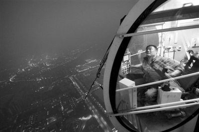 塔吊司机周瑜是117大厦12名塔吊司机之一,2012年国内最大的动臂式塔吊ZSL2700刚刚安装他就来了。大厦的钢板、钢筋、气瓶、钢构件都由塔吊司机来吊装,周瑜已经完成了近3万吊的吊装工作。