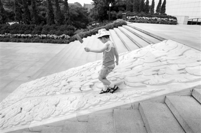 北京,一名小孩在中国人民抗日战争纪念馆门前的浮雕上玩耍。