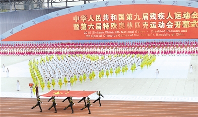 9月12日,中华人民共和国国旗在开幕式上入场。当日,中华人民共和国第九届残疾人运动会暨第六届特殊奥林匹克运动会在四川省成都市开幕。新华社记者 李欣 摄