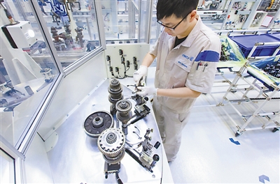 图为大众汽车自动变速器天津工厂的工人在装配车间进行零部件调试。于宛尼 摄