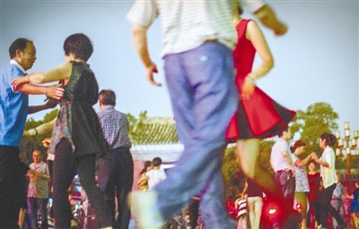 9月10日,北京地坛公园南门的广场前,人们正欢快地跳着交谊舞。本报记者 吴凡 摄