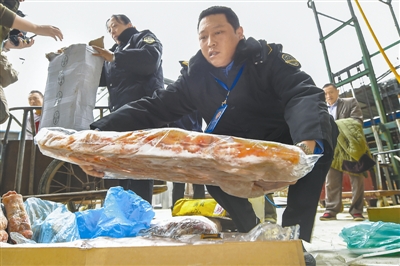 9月14日,贵州省食品药品监督管理局工作人员清点查获的走私冷冻动物制品。