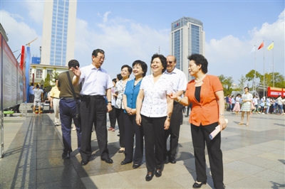 省委常委、宣传部长胡苏平(右三),省人大常委会副主任、省总工会主席田喜荣(右六),省政协副主席李悦娥(右四)观看女职工工作展板