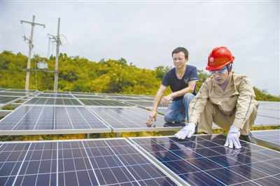 9月15日,彭小平(左)和电力公司的技术人员对光伏电板进行检查和清洁。当日,经过近2个月的试运行,重庆市涪陵区白涛街道高峰寺村返乡创业农民工彭小平的光伏发电站正式投入运行。