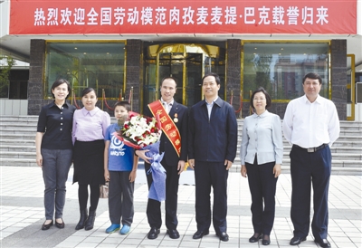 肉孜麦麦提·巴克被评为全国劳动模范后从北京载誉归来。克拉玛依市、新疆油田公司党委书记陈新发(右三)、克拉玛依市市长张红彦(左一)等领导与肉孜麦麦提·巴克的妻儿(左二、左三)一起迎接并合影留念