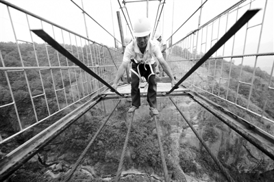他们将把一条长约300米、垂直高度达180米的木板吊桥,改造成完全透明的玻璃吊桥。这座玻璃吊桥名为石牛寨“好汉桥”,悬于峡谷之间,改造它需要经过加固主钢丝、立梁、测水平、拆木板、刷油漆等数十个大小工序,全部靠人力来完成,施工难度极大。