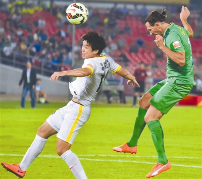 9月16日晚,在2015赛季中超联赛第24轮的一场补赛中,凭借德扬上演的帽子戏法,北京国安主场3比1战胜长春亚泰。图为北京国安外援德扬头球攻门。本报记者 许之丰 摄