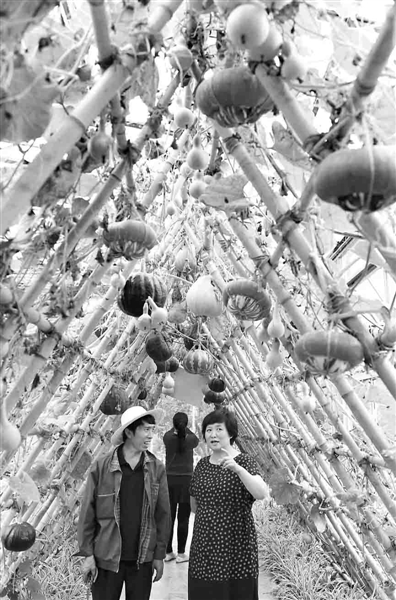 近日,龚艳琼(右)与工人在自己创建的昆明金殿“一丘田”农业科技观光园查看瓜果生长。