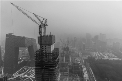 9月17日,北京CBD的一处工地。据北京市环境保护监测中心数据显示,17日上午北京市空气质量指数为209,是今年立秋以来首个重度雾霾天气,其首要污染物为PM2.5。午后,空气质量转为轻度污染。