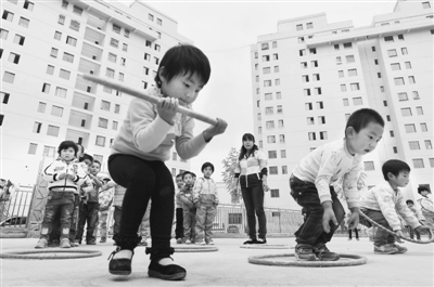 9月18日,在临夏回族自治州和政县第二幼儿园,孩子们开展体育活动。