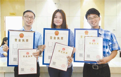 9月21日,在南昌市行政服务中心,江西省首批领取“一照一码”营业执照的企业代表在展示营业执照和副本。