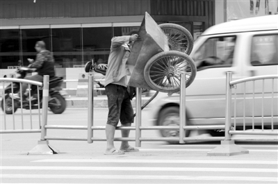 农民工抱手推车翻越护栏