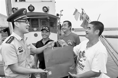 在中秋佳节来临之际,福建省连江县黄岐边防派出所民警来到台轮停泊点,为马祖乡亲们送上节日的祝福,并与他们一起吃月饼、叙乡情,共迎中秋佳节的到来。