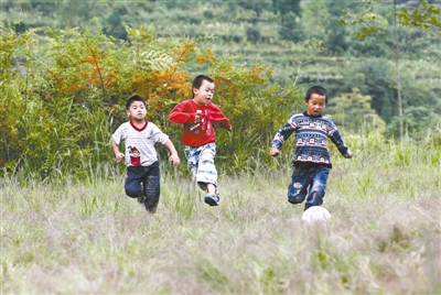 9月23日,红星村小学的孩子们在踢足球。该校是重庆山区一所只有12名一年级学生,1名教师的微小学。今年4月,爱心团体为该校捐赠了足球、球门及球场围栏,将天然草坪“变身”为足球场。有了足球场之后,孩子们经常踢球跑动,欢快的笑声洋溢在大山之中。