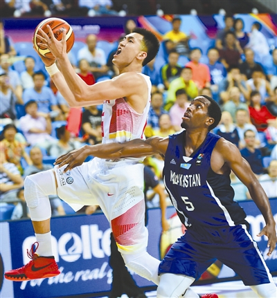 9月27日晚,中国男篮在亚锦赛复赛第一场比赛中,以75比62战胜哈萨克斯坦。图为中国队队员郭艾伦突破上篮。