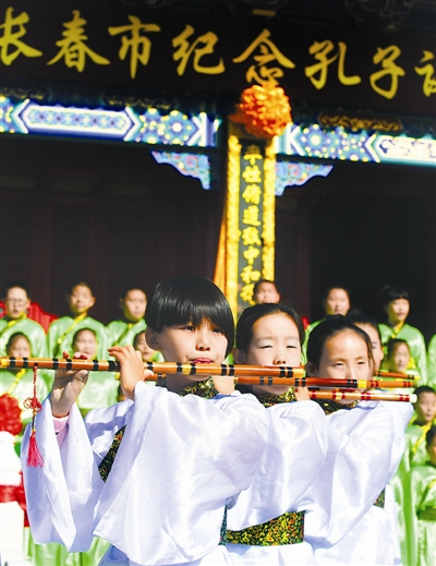 9月28日,孩子们在长春文庙举行的祭孔大典上演奏。