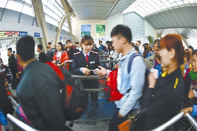 10月7日,旅客在宁夏银川火车站检票进站。