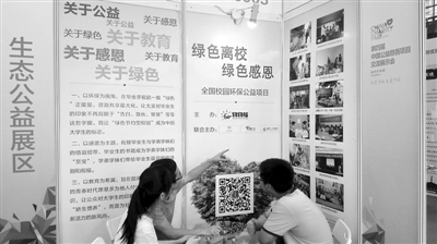 在近日举办的中国第四届公益慈善项目交流展示会现场,大型校园环保公益项目——“绿色离校·绿色感恩”项目的有关人士表示,“绿色离校”项目将带动更多的志愿者和毕业生加入到行动中去,实现资源的最大循环利用,并宣布10月20日之前,免费分发16.5万册书籍给在校学子,而这些书籍皆来源于今年毕业季期间各大高校毕业生们的捐赠。图为工作人员在推介“绿色离校”项目。文森 摄