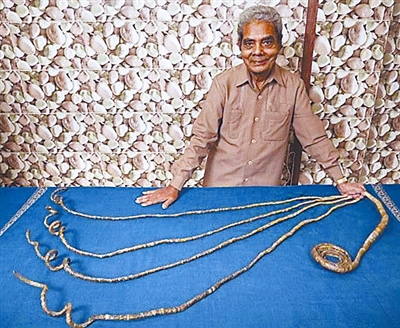 据外媒报道,印度78岁老翁奇拉尔自1952年起就未修剪过左手指甲,近63年来5只指甲总共长达909.6厘米,其中拇指指甲长197.8厘米、中指186.6厘米、无名指181.6厘米、小指179.1厘米、食指164.5厘米,近日他正式被吉尼斯世界纪录确认为单手指甲最长的人,实现了自己人生中最大的目标。