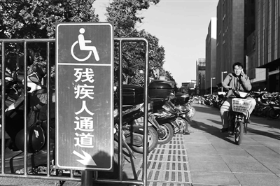 在济南市泉城路,残疾人通道附近停满了车辆(10月11日摄)。