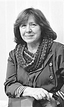 比起作家,阿列克谢耶维奇更合适记者这个称谓。1948年出生于乌克兰,明斯克新闻学系毕业后,阿列克谢耶维奇成了一名记者。她先为一家文学杂志工作,后在几家报社工作。先后出版了《我是女兵,也是女人》、《最后一个证人》、《锌皮娃娃兵》、《死亡的召唤》、《切尔诺贝利的回忆:核灾难口述史》等非虚构题材作品。从第二次世界大战到阿富汗战争再到苏联解体、切尔诺贝利事故她的作品都有涉及。她的采访方式被评论界称为“人海战术”,关于切尔诺贝利事件,她先后走访了500名幸存者,历时3年。她的每本书都是这样进行采访准备的。