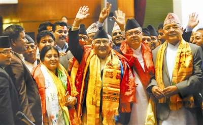 11日,在尼泊尔加德满都,尼泊尔新一任总理卡德加·普拉萨德·夏尔马·奥利(中)向支持者招手致意。尼泊尔议会11日举行总理选举,尼泊尔第二大党尼泊尔共产党(联合马列)主席奥利当选。新华社发(苏尼尔·夏尔马 摄)