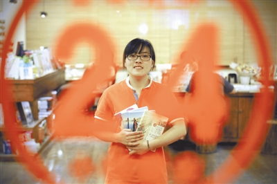 7月31日,山东省青岛市,晚上10点,明阅岛24小时书店,店员小梁站在橱窗前。这里是青岛唯一一家24小时书店,28岁的店员小梁要从晚上8点工作到次日上午8点。志闻/CFP