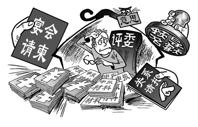 庞博也曾是被“活动”的对象。去年6月,一位只有点头之交的同校老师给庞博打电话,“晚上6点,学校南门酒楼聚一聚”。庞博认为关系不熟先是回绝了,但此后的一周时间里,这位老师坚持每天打电话邀请,庞博抹不开情面就去了,赴宴时才发现被邀请的还有其他评委。几杯酒下肚,进入正题,原来这位老师今年要评副教授,希望得到关照。