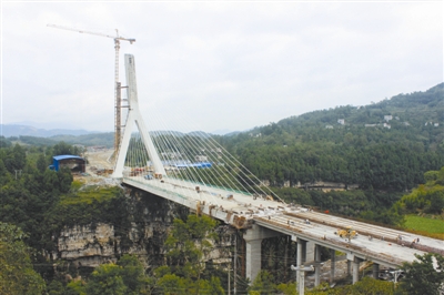 10月5日,我国首座地锚式斜塔斜拉桥——贵州道安高速公路芙蓉江大桥主梁段混凝土浇筑顺利合拢,建桥工人转向桥面施工。