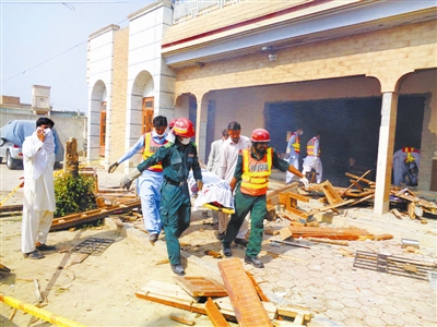 14日,在巴基斯坦中部德拉加齐汗地区,救援人员在爆炸现场工作。德拉加齐汗地区一名议员的竞选办公室当天中午遭自杀式爆炸袭击,造成至少7人死亡、12人受伤。 新华社发