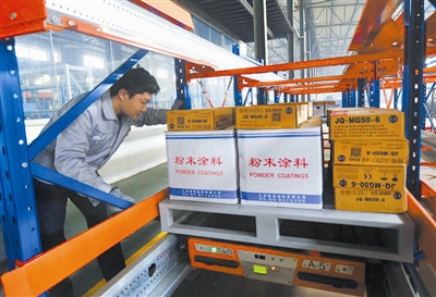 10月15日,香河县新兴产业示范区金华帝金属制品有限公司职员用穿梭车演示自动出入库。