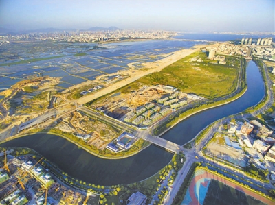 厦门“城市海绵”试点建设区——海沧马銮湾片区正在加紧建设(10月16日摄)。马銮湾片区包含了59个海绵城市建设项目。