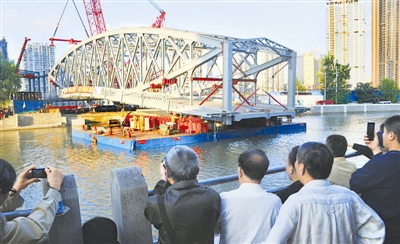 10月18日,上海,“离家体检治疗”4个多月的浙江路桥开始“回家之旅”。经历了4个多月紧张施工,107岁的浙江路桥整修一新。本次维修最大亮点是“修旧如旧”,大桥以“交通灰”新颜重现1908年的桥头门形设计。 杨奕 摄/CFP