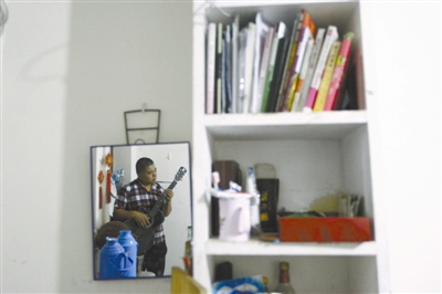 图为李运晓在摆弄自己的吉他。